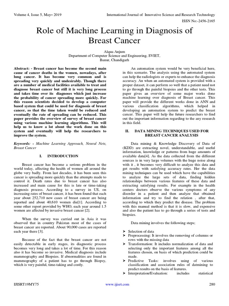 2020 breast cancer diagnosis using image processing and machine learning. Breast cancer is a prevalent cause of death and it is the only type of cancer that is widespread among women worldwide many imaging techniques have been developed for early detection and treatment of breast cancer and to reduce the number of deaths and many aided breast cancer diagnosis methods have been used to increase the diagnostic accuracy 3 4. Machine learning is widely used in bio informatics and particularly in breast cancer diagnosis.